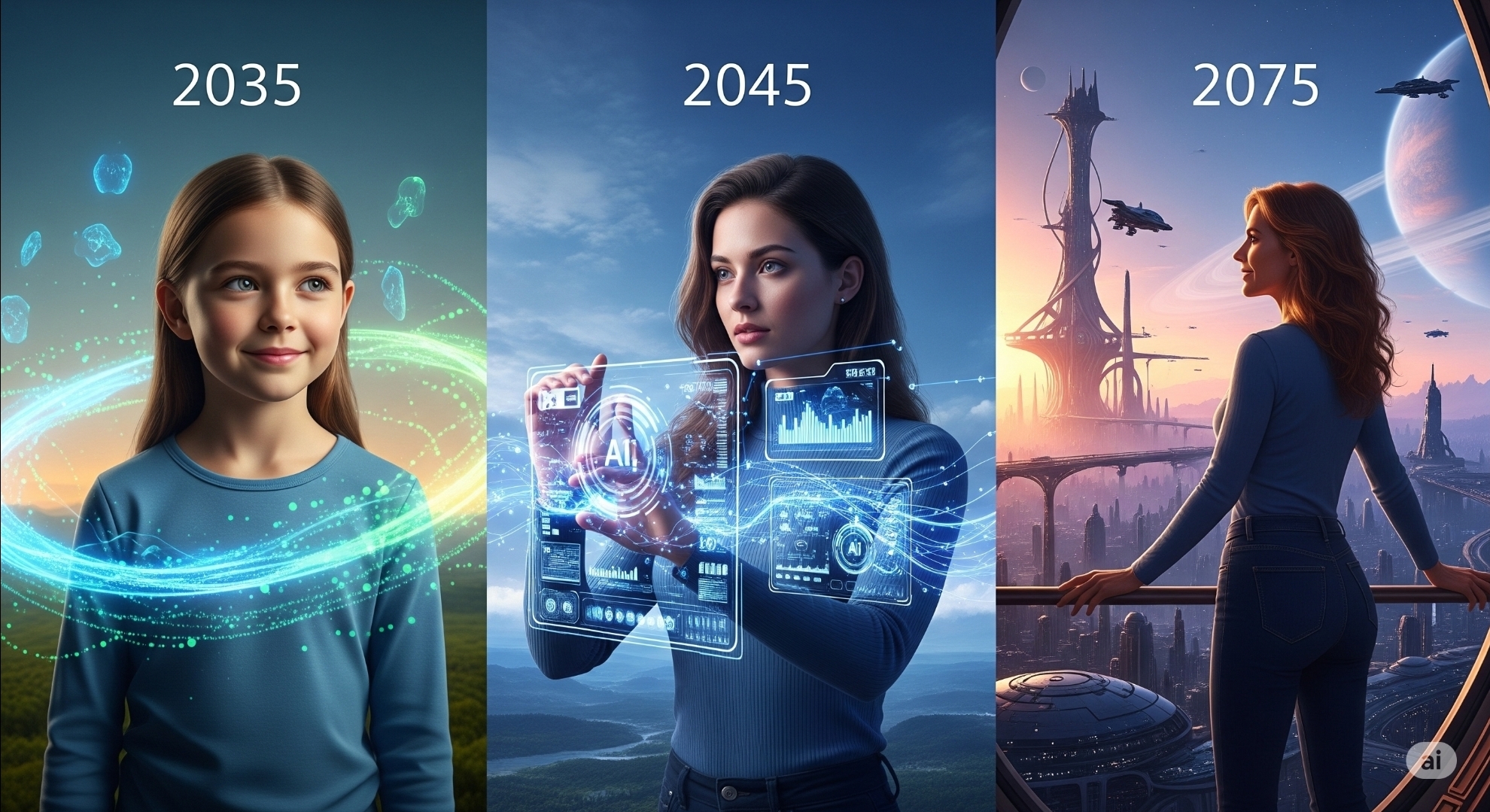 2075 (Age 50): Aging is optional. She cycles through careers and identities, spanning centuries as humanity pushes toward the stars.